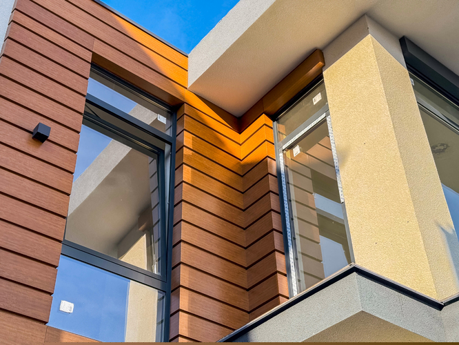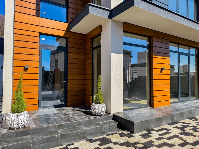 Отделка фасада комбинированная — декоративная штукатурка, декоративные панели, алюкобонд. Ограждение балконов и эксплуатируемой кровли — стекло триплекс. Благодаря панорамному алюминиевому остеклению дома наполнены большим количеством естественного света. Инженерия посёлка отвечает всем современным требованиям, все коммуникации центральные.